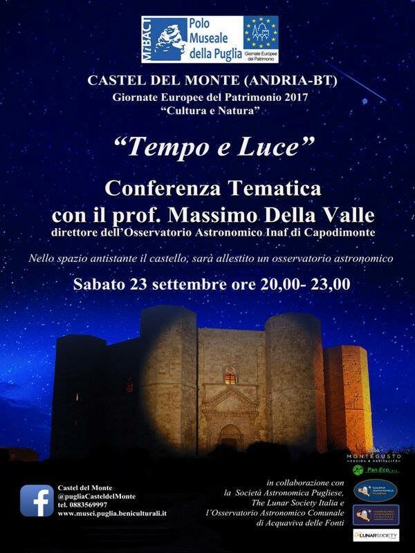 Sabato 23 settembre 2017 nell'ambito delle Giornate Europee del Patrimonio Castel del Monte resterà aperto anche di sera dalle h 20.00 alle h 23.00 ( la biglietteria chiude alle h 22:30) e l'ingresso in questa fascia oraria costerà solo € 1,00. La Nova Apulia a partire dalle h 20,00 organizza una visita guidata tematica che evidenzierà le relazioni tra l'architettura del castello e l'astronomia. Necessaria la prenotazione al 388.3026000, Questo indirizzo email è protetto dagli spambots. È necessario abilitare JavaScript per vederlo.