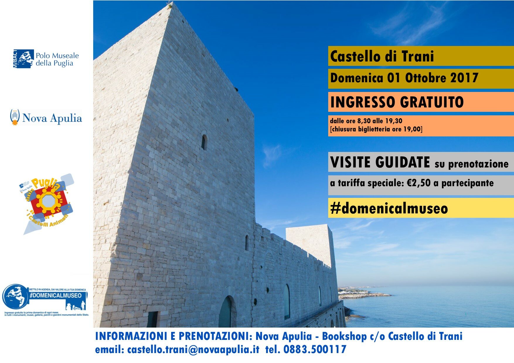 In occasione della prima Domenica di Ottobre torna l'iniziativa del Mibact #domenicalmuseo, con ingresso gratuito in tutti i monumenti. Presso il Castello Svevo di Trani vi attendono le guide Nova Apulia per le consuete visite guidate a tariffa agevolata a partire dalle ore 10:00. Comprese nel percorso di visita sono le mostre "Light Music" di Brian Eno, "Viaggio a Trani" di Jorrit Tornquist e la mostra fotografica “Il paesaggio marittimo della Costa Adriatica” curata dall’Arch. Rosa Mezzina, direttore del Castello.