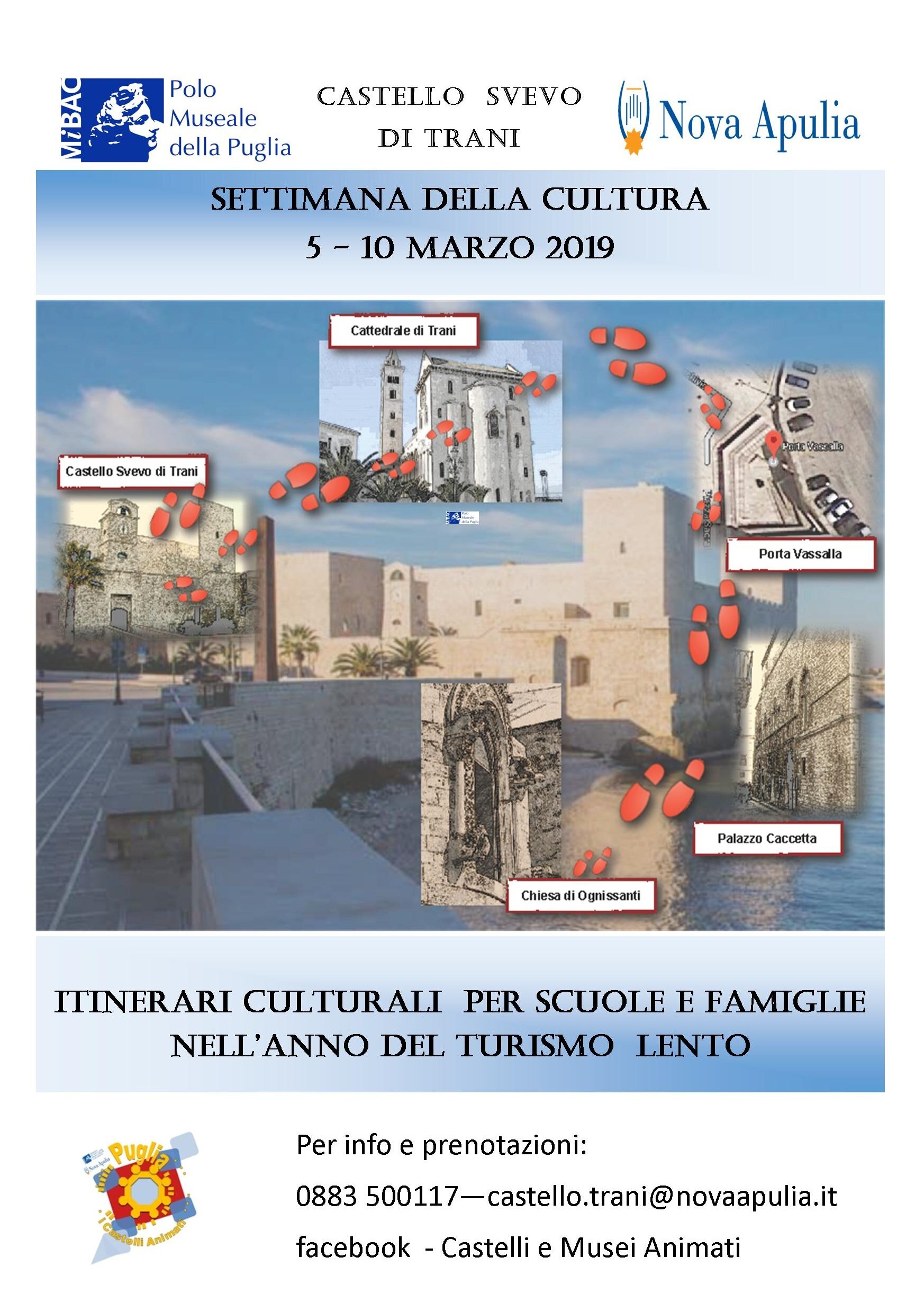 Nova Apulia (società concessionaria del Ministero dei Beni e delle Attività Culturali per la gestione integrata dei servizi nei Castelli e nei Musei statali in Puglia) propone, infatti, una serie di attività volte alla conoscenza e all'approfondimento della storia, dell'arte e dell'architettura di Trani, "città della pietra".