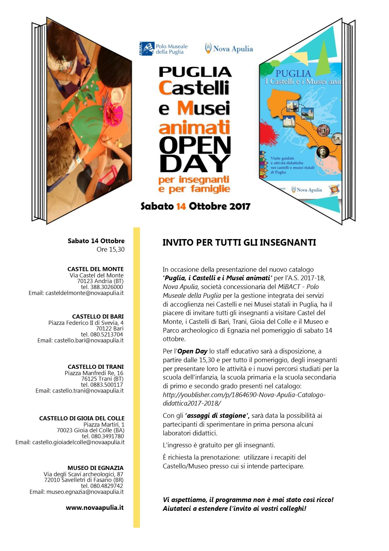 Ore 16,00 Presentazione del catalogo: ‘Puglia, i Castelli e i Musei animati’ per l’A.S. 2017-18