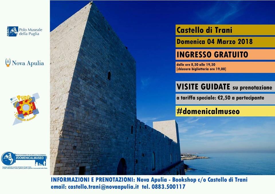Si svolgerà anche al Castello di Trani, nel pomeriggio di sabato 14 ottobre, l’Open Day per gli insegnanti e per le famiglie promosso da Nova Apulia Scarl, società concessionaria del Ministero dei beni e le attività culturali e del turismo per la gestione integrata dei servizi di accoglienza e didattica museale nei più importanti Luoghi della cultura in Puglia.