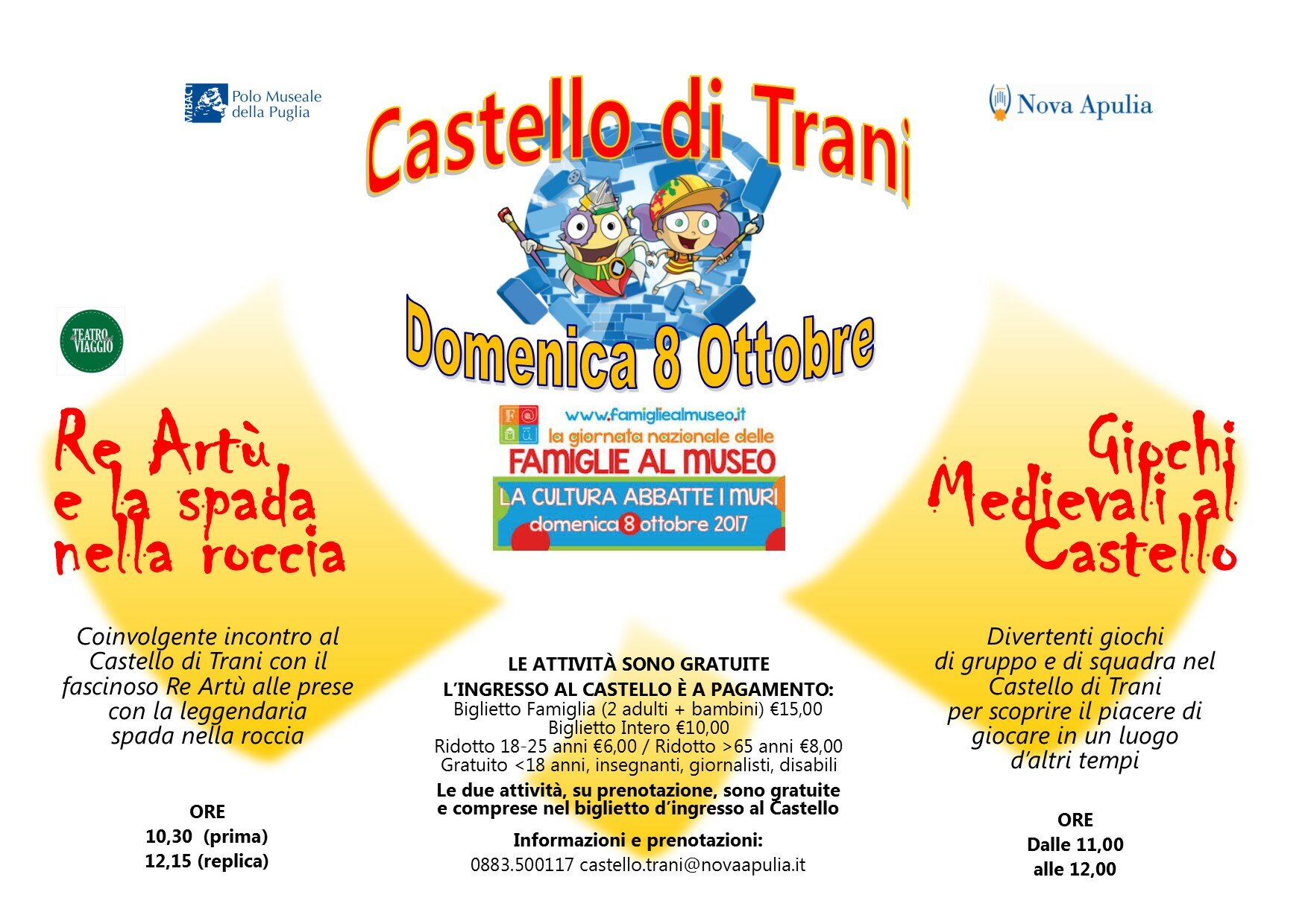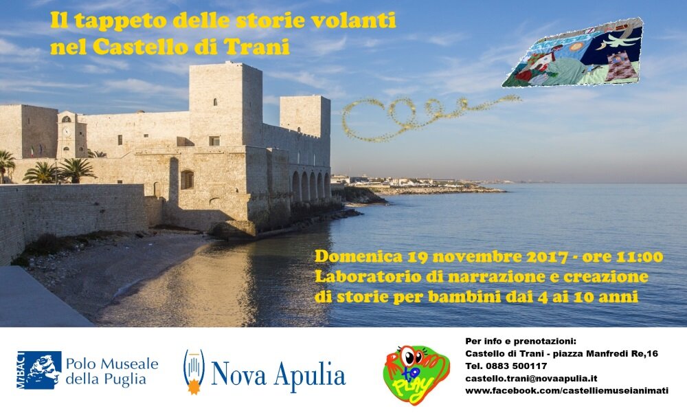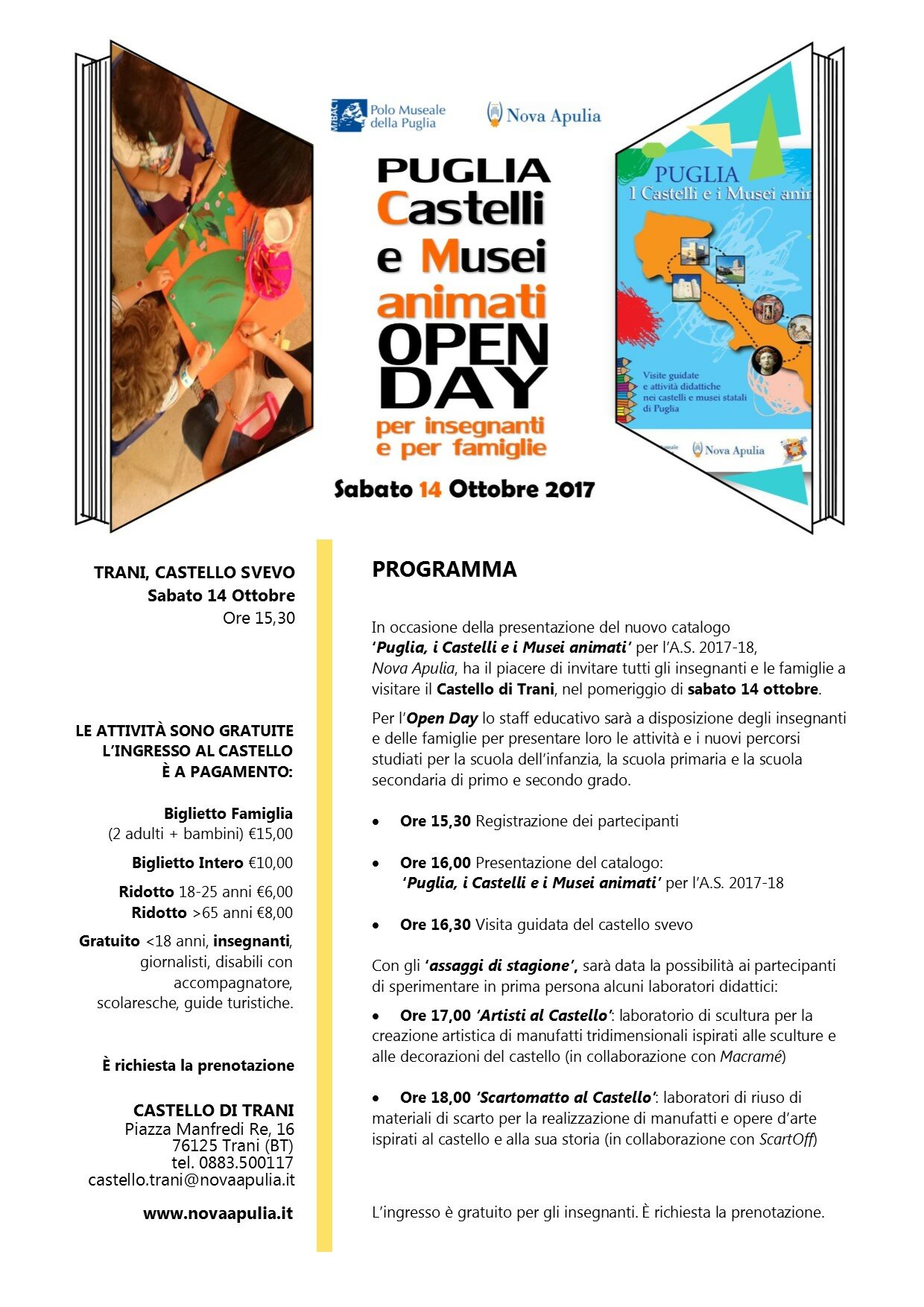 Sabato 14 ottobre l’Open Day per insegnanti e famiglie: Nova Apulia presenta al Castello di Trani le attività ludico-didattiche del progetto ‘Puglia, i Castelli e i Musei animati’.