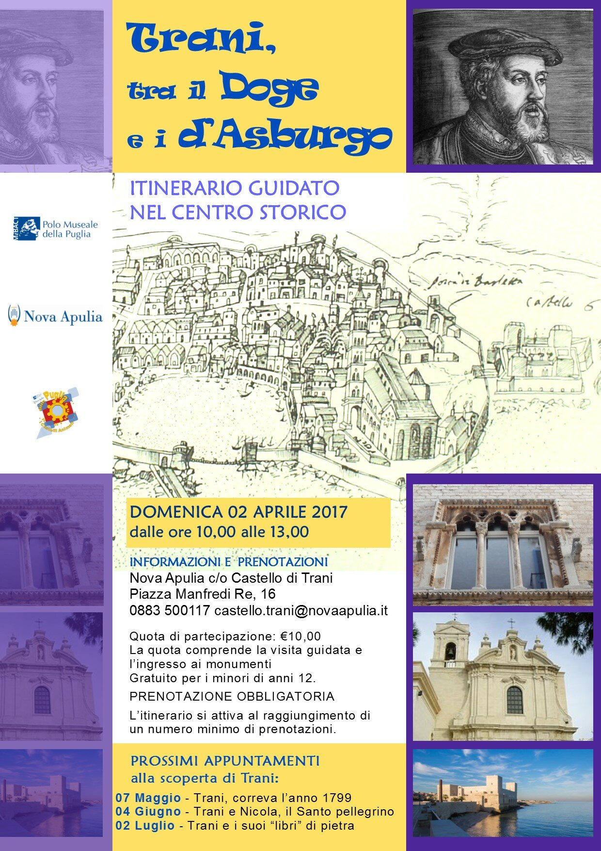 Continuano le proposte domenicali alla scoperta di Trani promosse da Nova Apulia, con un interessante e ricco calendario: un incontro ogni prima domenica del mese. Il prossimo appuntamento è “Trani, tra il Doge e i d'Asburgo”, in programma domenica mattina 2 aprile 2017.
