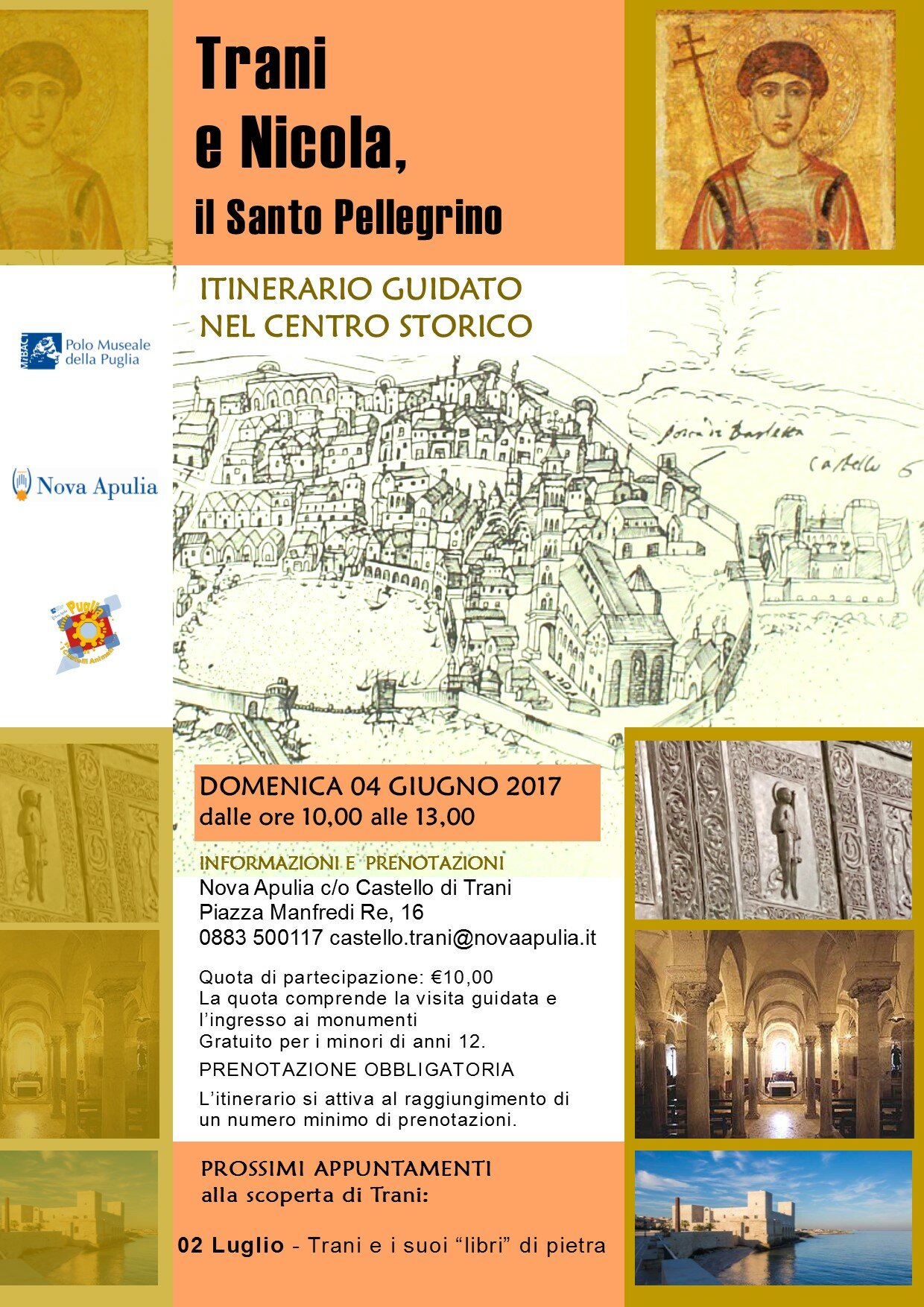 Continuano le proposte domenicali alla scoperta di Trani promosse da Nova Apulia, con un interessante e ricco calendario: un incontro per ogni prima domenica del mese. Il prossimo appuntamento è “Trani e Nicola, il Santo pellegrino”, in programma domenica mattina 4 giugno 2017, a ridosso della festa patronale.