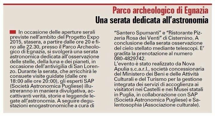 "Una serata dedicata all'astronomia" Scritto da Super User. Pubblicato in Stampa Da "La Gazzetta del Mezzogiorno" (Edizione Brindisi) StampaEmail