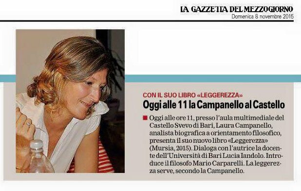 "Con il suo libro Leggerezza. Oggi alle 11 la Campanello al Castello" Scritto da Super User. Pubblicato in Stampa da "La Gazzetta del Mezzogiorno" StampaEmail