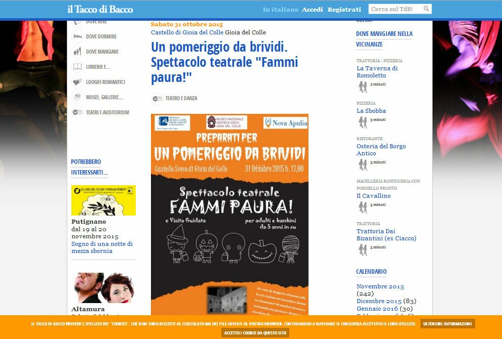 "Un pomeriggio da brividi. Spettacolo teatrale Fammi Paura! Scritto da Super User. Pubblicato in Stampa da "Il Tacco di Bacco" https://iltaccodibacco.it/puglia/eventi/142421.html StampaEmail