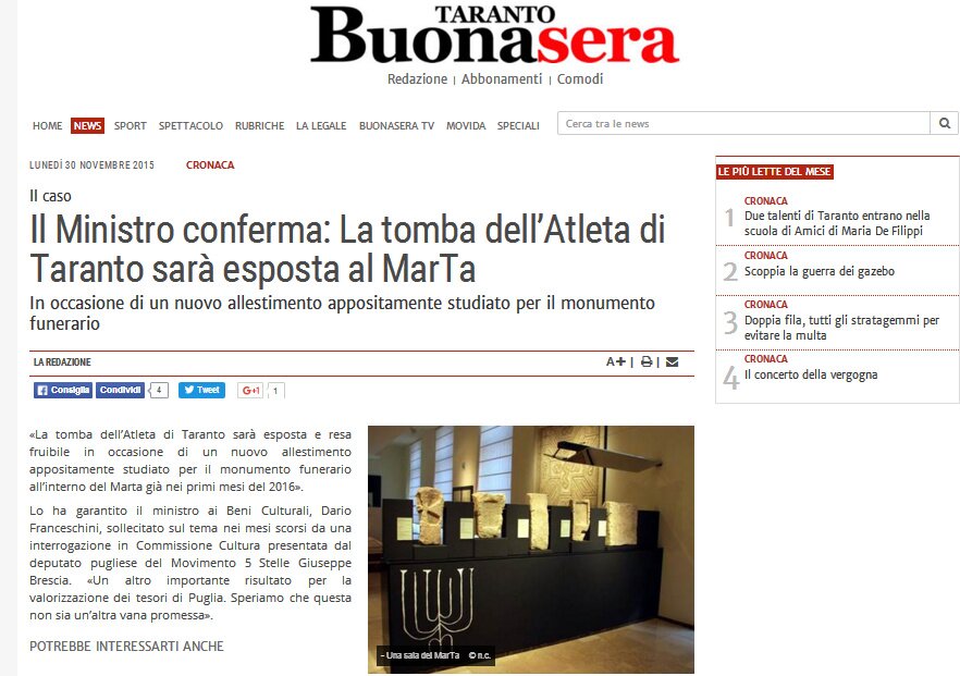 "Il Ministro conferma: La tomba dell\u2019Atleta di Taranto sar\u00e0 esposta al MarTa" Scritto da Super User. Pubblicato in Stampa da "Taranto Buona Sera" https://www.tarantobuonasera.it/taranto-news/cronaca/402438/news.aspx StampaEmail
