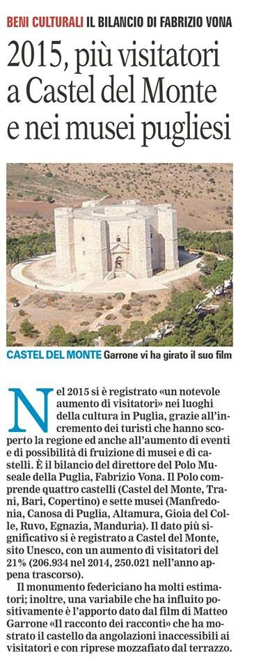 "2015, pi\u00f9 visitatori a Castel del Monte e nei musei pugliesi" Scritto da Super User. Pubblicato in Stampa da "La Gazzetta del Mezzogiorno" StampaEmail